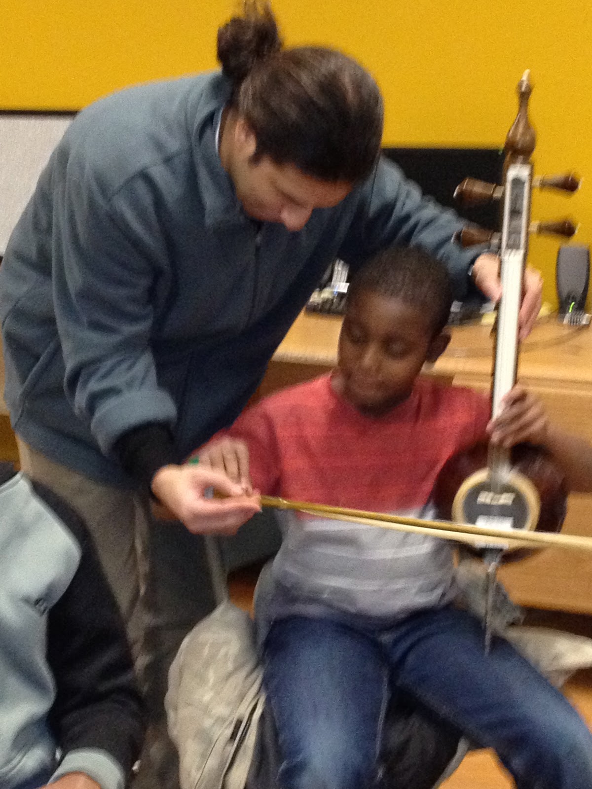 RI Fiddle Project students were visited by Iranian musician Nima Jan and his kemanche last week. He spoke with students about the ways it is similar to a violin, played a piece with small groups of students, and gave them each chance to try playing the kemanche.